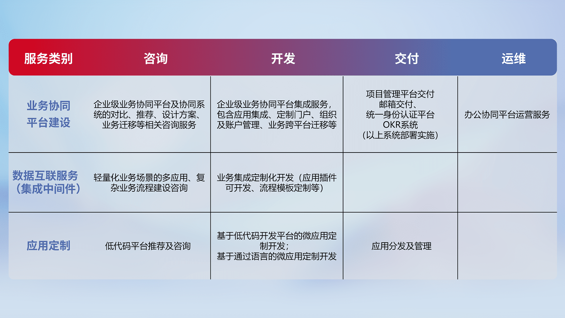 针对钉钉、、、、企微、、IDaas等平台级产品提供产品的规划、、、方案、、交付、、、定制化开发等服务,,,实现如统一协同办公、、智能客户服务、、混合会议管理、、、智能数据查询、、等业务场景,,,实现数字化转型。。